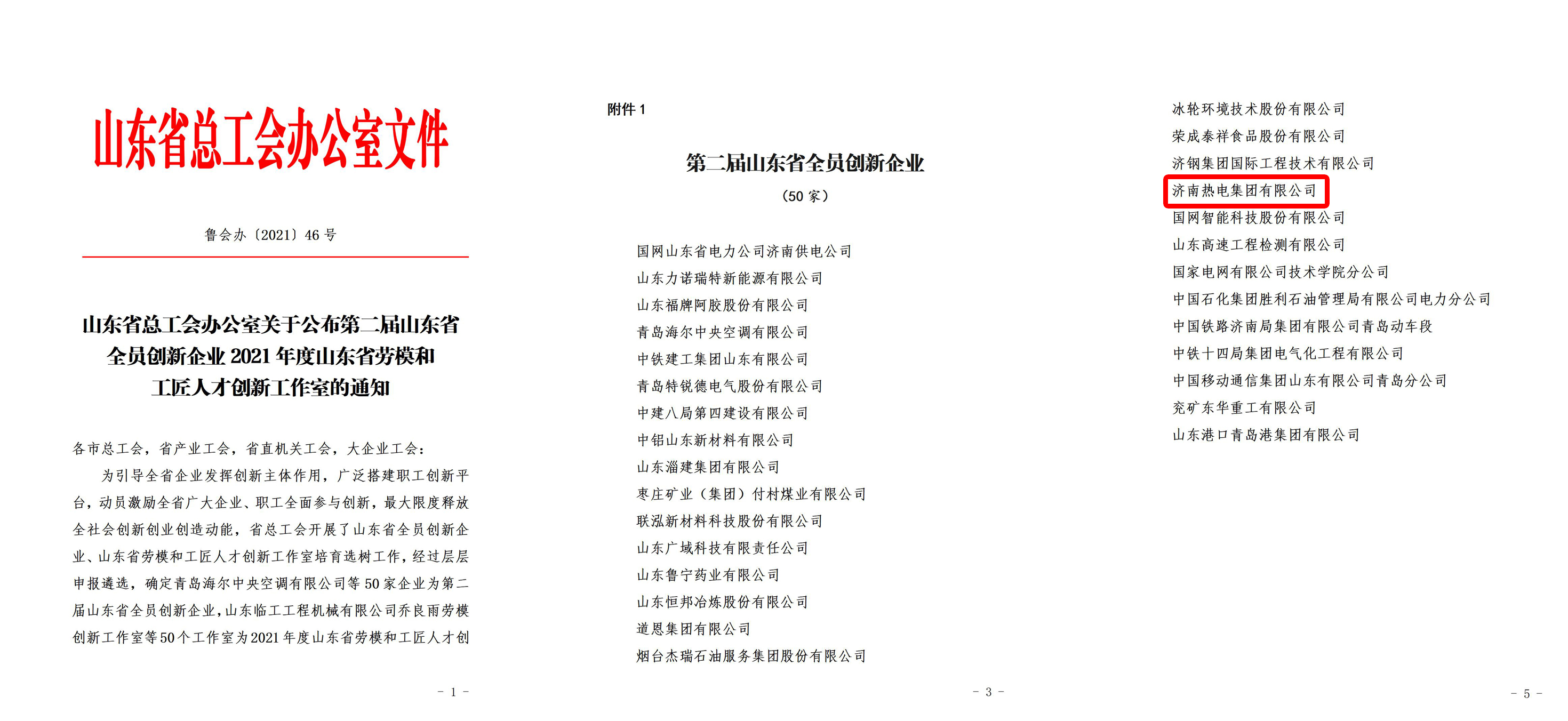 濟(jì)南熱電集團(tuán)榮獲山東省全員創(chuàng)新企業(yè)