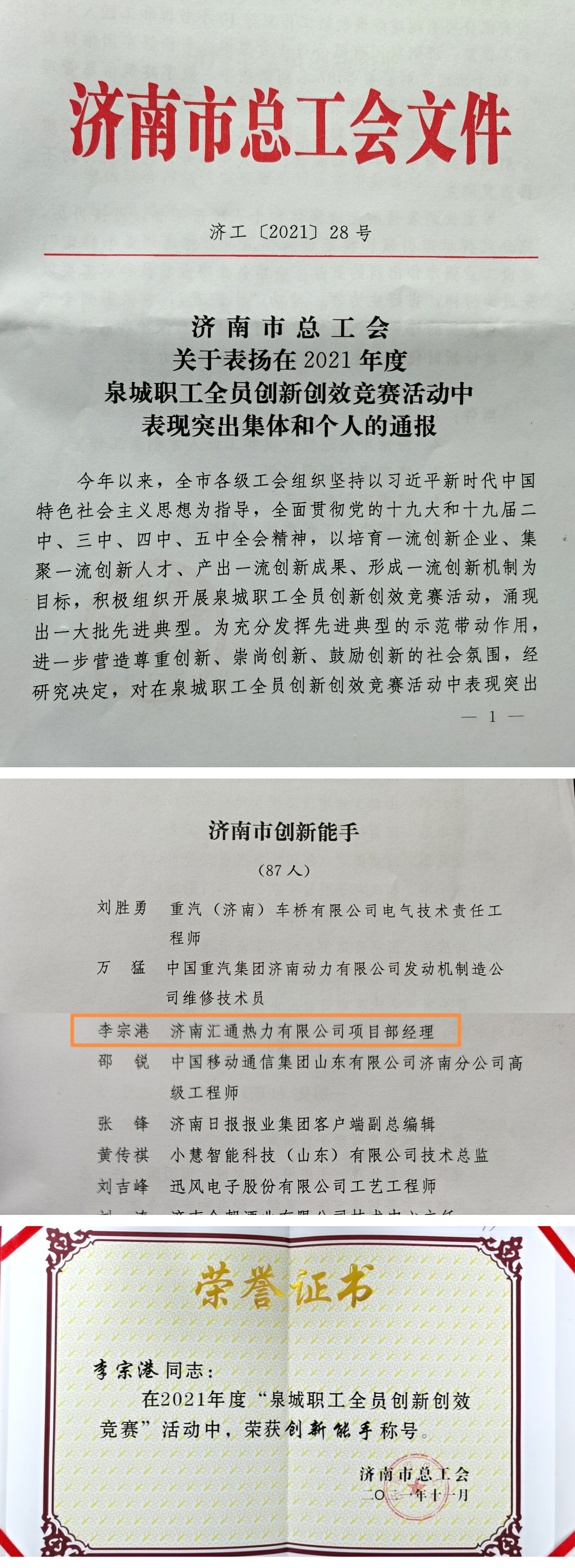 濟(jì)南能源集團(tuán)所屬工程集團(tuán)匯通熱力李宗港在2021年度泉城職工全員創(chuàng)新創(chuàng)效競賽活動(dòng)中榮獲“濟(jì)南市創(chuàng)新能手”稱號(hào)