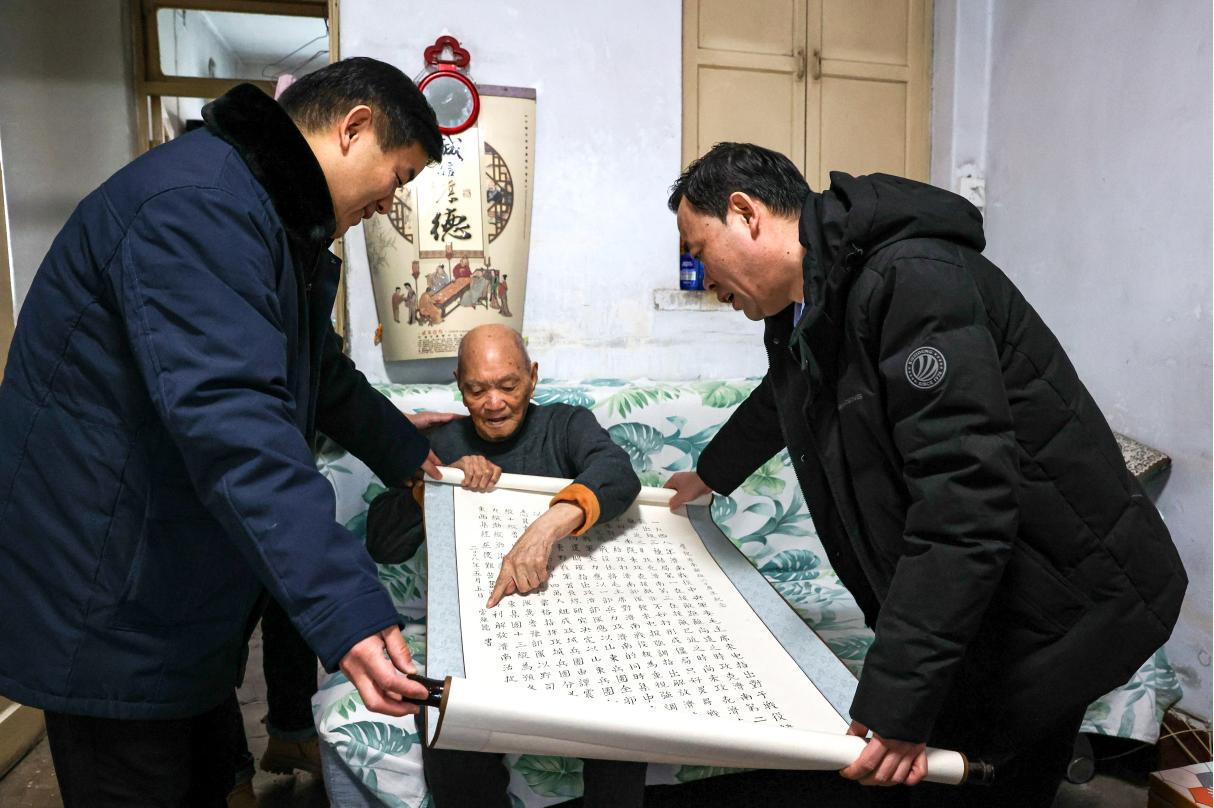 濟(jì)南能源集團(tuán)黨委委員、副總經(jīng)理、工會主席王維青走訪慰問離休老黨員常維德,并將散發(fā)著淡淡墨香、承載著幸福祥和的福字送到老同志手中,常維德也興奮地向大家展示了他創(chuàng)作的書畫作品。