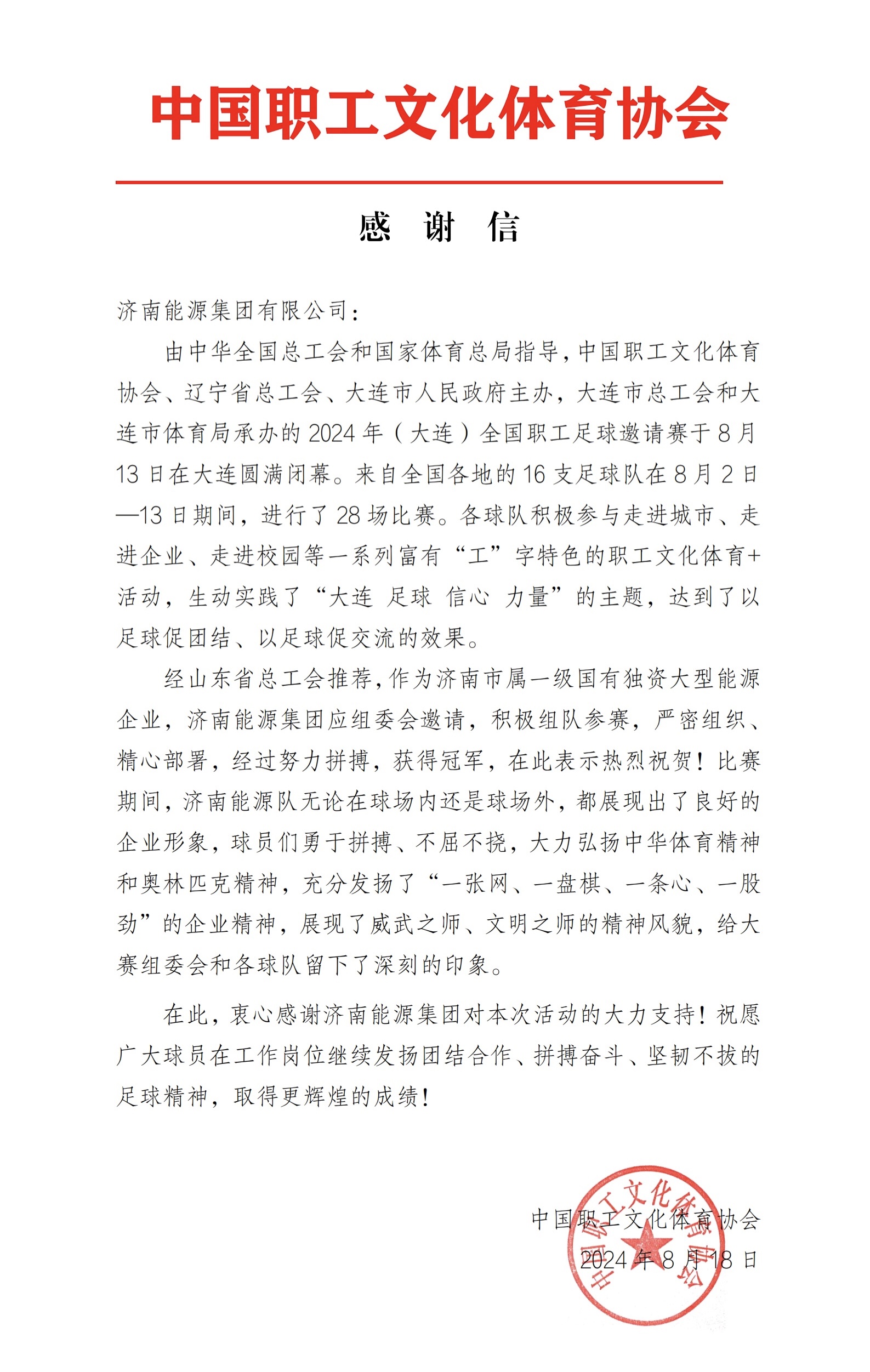 8月13日,2024年(大連)全國職工足球邀請(qǐng)賽在大連圓滿落下帷幕,來自全國8個(gè)省份16家企事業(yè)單位的職工足球隊(duì)共赴此次競技之旅,經(jīng)過12天緊張激烈的角逐,濟(jì)南能源集團(tuán)齊魯暖萬家足球隊(duì)一路過關(guān)斬將進(jìn)入決賽,最終獲得本屆比賽的冠軍,并獲得最佳企業(yè)形象獎(jiǎng)和優(yōu)秀組織獎(jiǎng)。