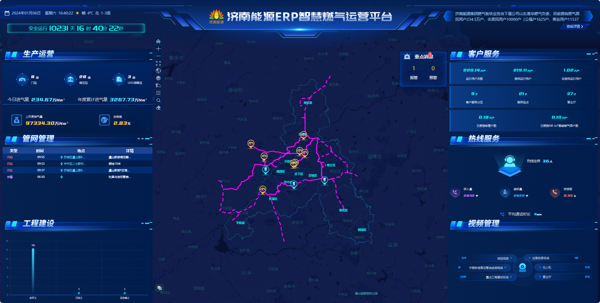 目前,濟(jì)南能源智慧燃?xì)膺\(yùn)營平臺(tái)已經(jīng)將工程建設(shè)、通氣點(diǎn)火、安檢維修、管網(wǎng)巡檢等生產(chǎn)運(yùn)營和服務(wù)全流程納入其中,一圖展示、一屏呈現(xiàn),通過自動(dòng)化數(shù)據(jù)分析和智能監(jiān)控等手段,讓地下每根“毛細(xì)血管”都“清晰可見”,調(diào)度人員能實(shí)時(shí)掌握運(yùn)行狀況,及時(shí)進(jìn)行氣源調(diào)配,保障千家萬戶的用氣安全。