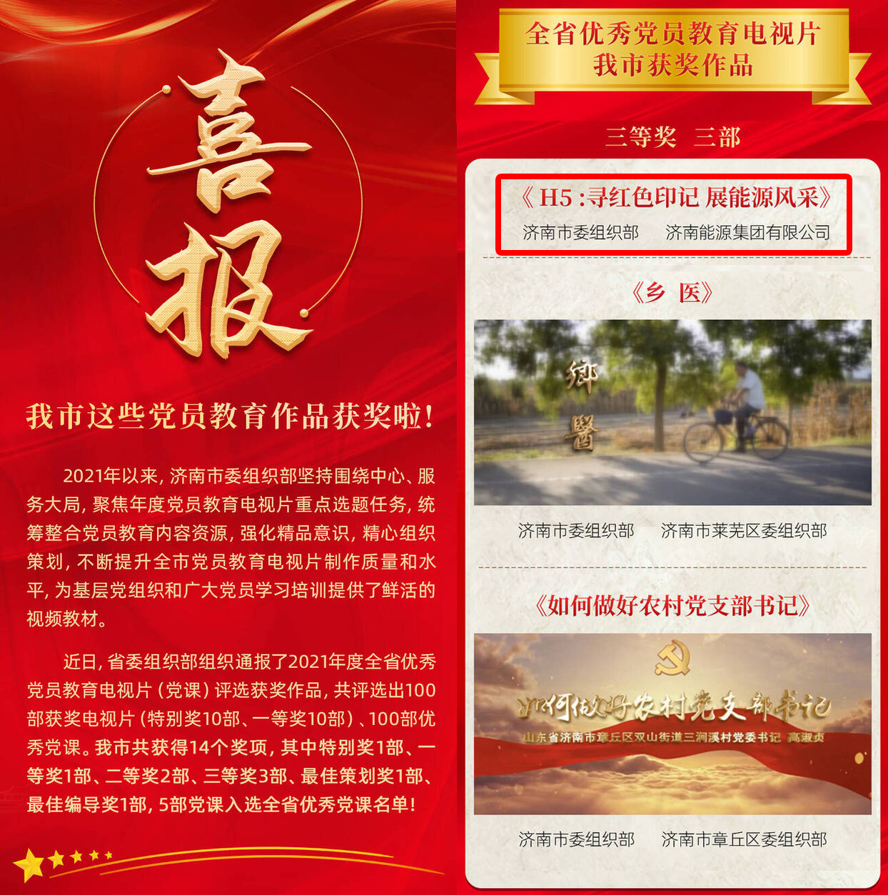 近日,山東省委組織部通報(bào)了2021年度全省優(yōu)秀黨員教育電視片(黨課)評(píng)選獲獎(jiǎng)作品中,濟(jì)南能源集團(tuán)制作的微信小程序《尋紅色印記 展能源風(fēng)采》榮獲全省三等獎(jiǎng),這是濟(jì)南市唯一一家企業(yè)獲獎(jiǎng)。同時(shí),在市國(guó)資委與市廣播電視臺(tái)共同組織開展的“展國(guó)企風(fēng)采 樹時(shí)代先鋒”國(guó)企風(fēng)采視頻評(píng)選展播活動(dòng)中,集團(tuán)制作的獻(xiàn)禮建黨100周年MV《紅船向未來(lái)》獲得“視頻最佳作品”獎(jiǎng),集體創(chuàng)意形象宣傳片《賦能城市生長(zhǎng)》榮獲“視頻創(chuàng)意作品”獎(jiǎng),并將在濟(jì)南電視臺(tái)進(jìn)行展播,為慶祝建黨一百周年和黨史學(xué)習(xí)教育增添了濃墨重彩的一筆。