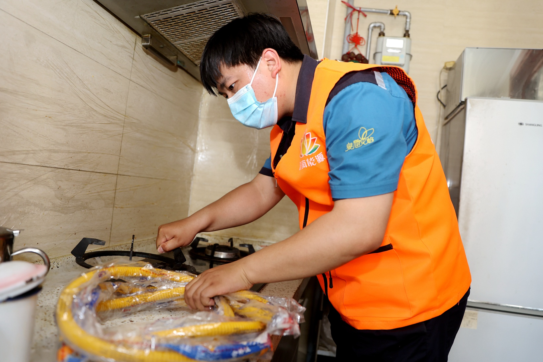 經(jīng)安檢人員檢查,發(fā)現(xiàn)老人家的軟管、報(bào)警器和電磁閥都臨近到期,工作人員靳新濤對(duì)老人說:“奶奶,您家的燃?xì)庠O(shè)施該換了,我給您免費(fèi)換成新的,您就能放心用啦!”老人聽后很是開心。就在工作人員快要更換完成的時(shí)候,靳新濤接到了宣傳咨詢臺(tái)打來的電話,表示2號(hào)樓有位91歲的老大爺前去登記,說自家孩子明天要帶全家去煙臺(tái),務(wù)必今天要為老人家更換完成。“202是吧?正好,我正在老人家換著呢。”