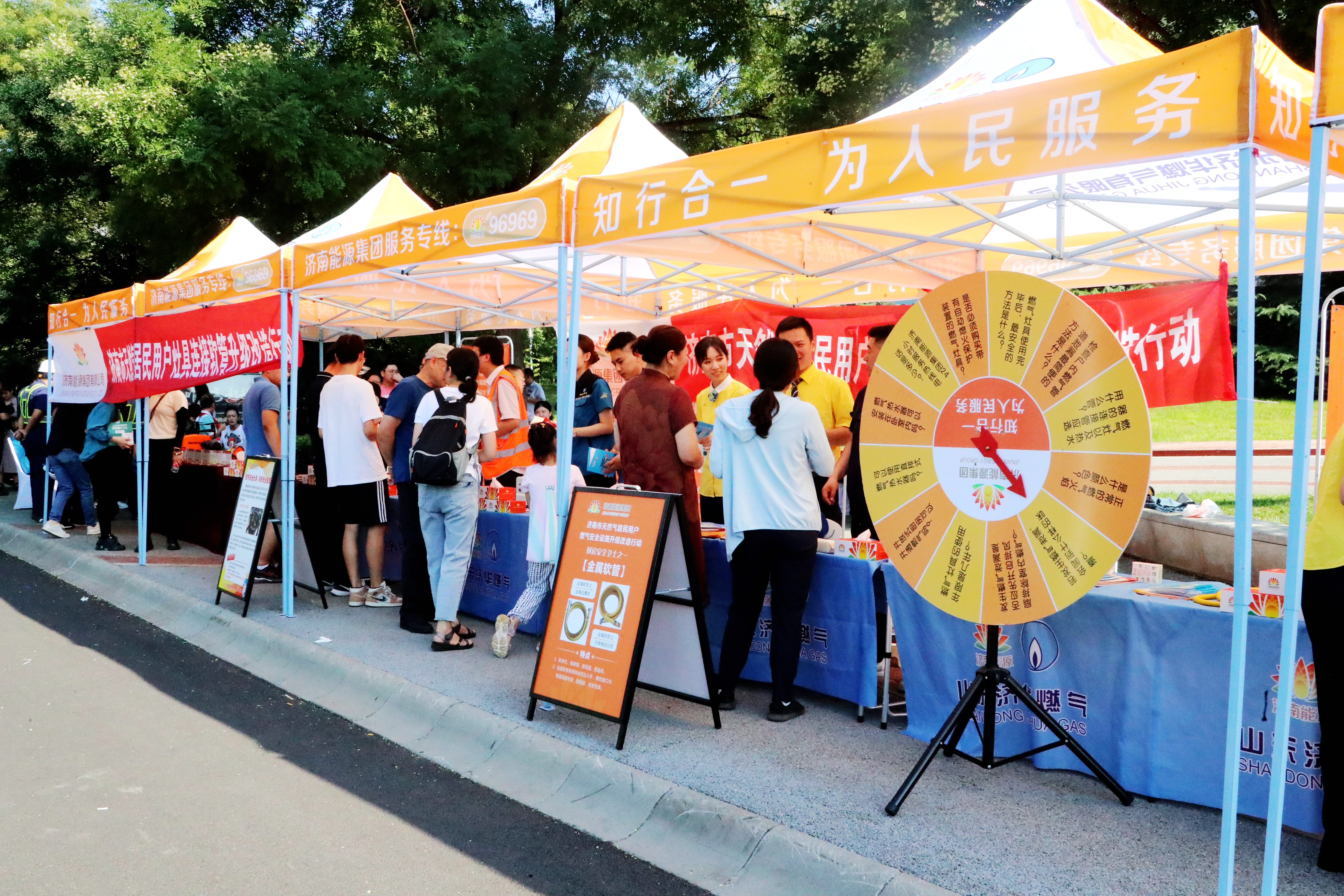 帳篷下,身穿橙色馬甲的工作人員站在宣傳咨詢臺前,抬頭微笑著,落落大方地招呼著前來咨詢的居民用戶們。