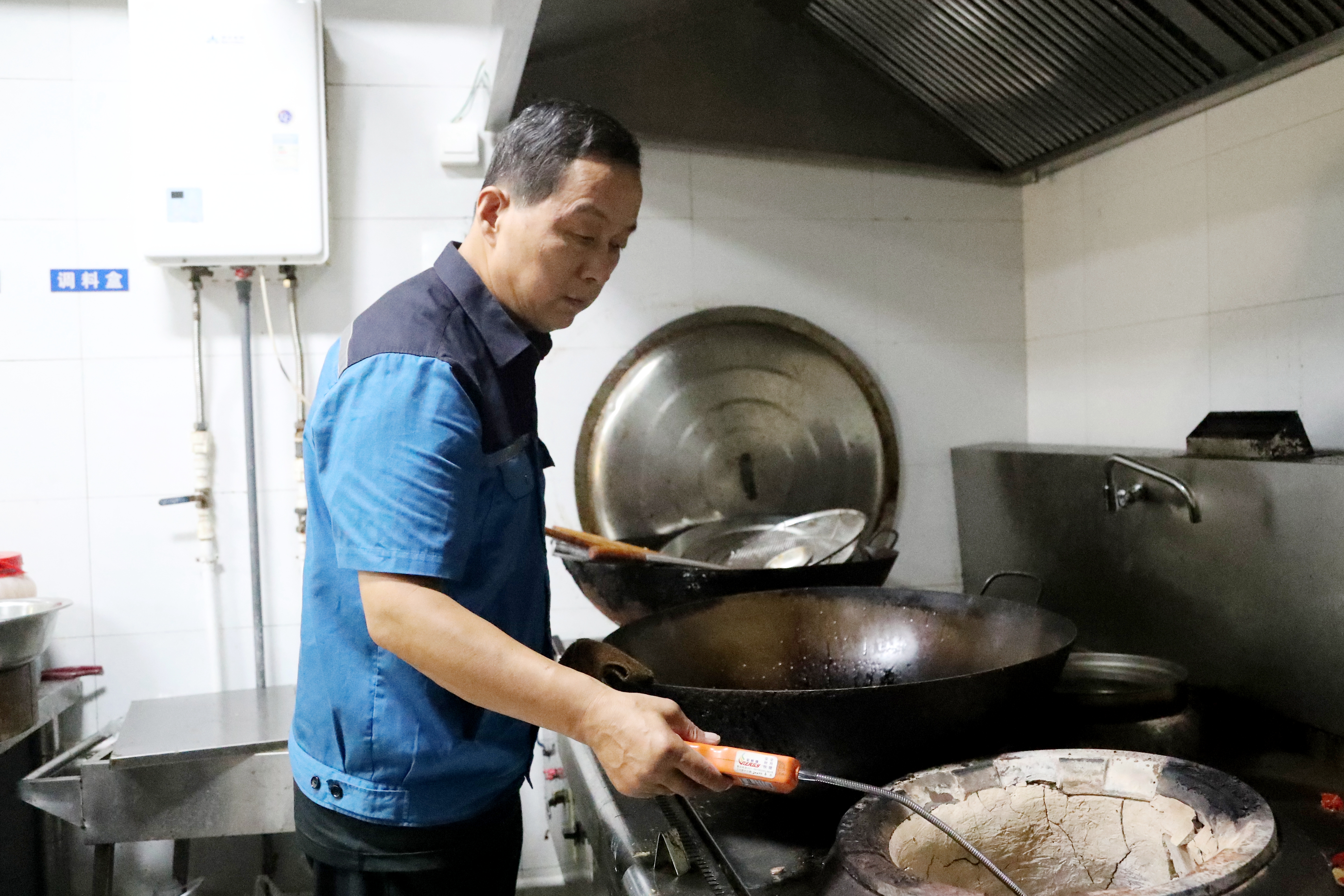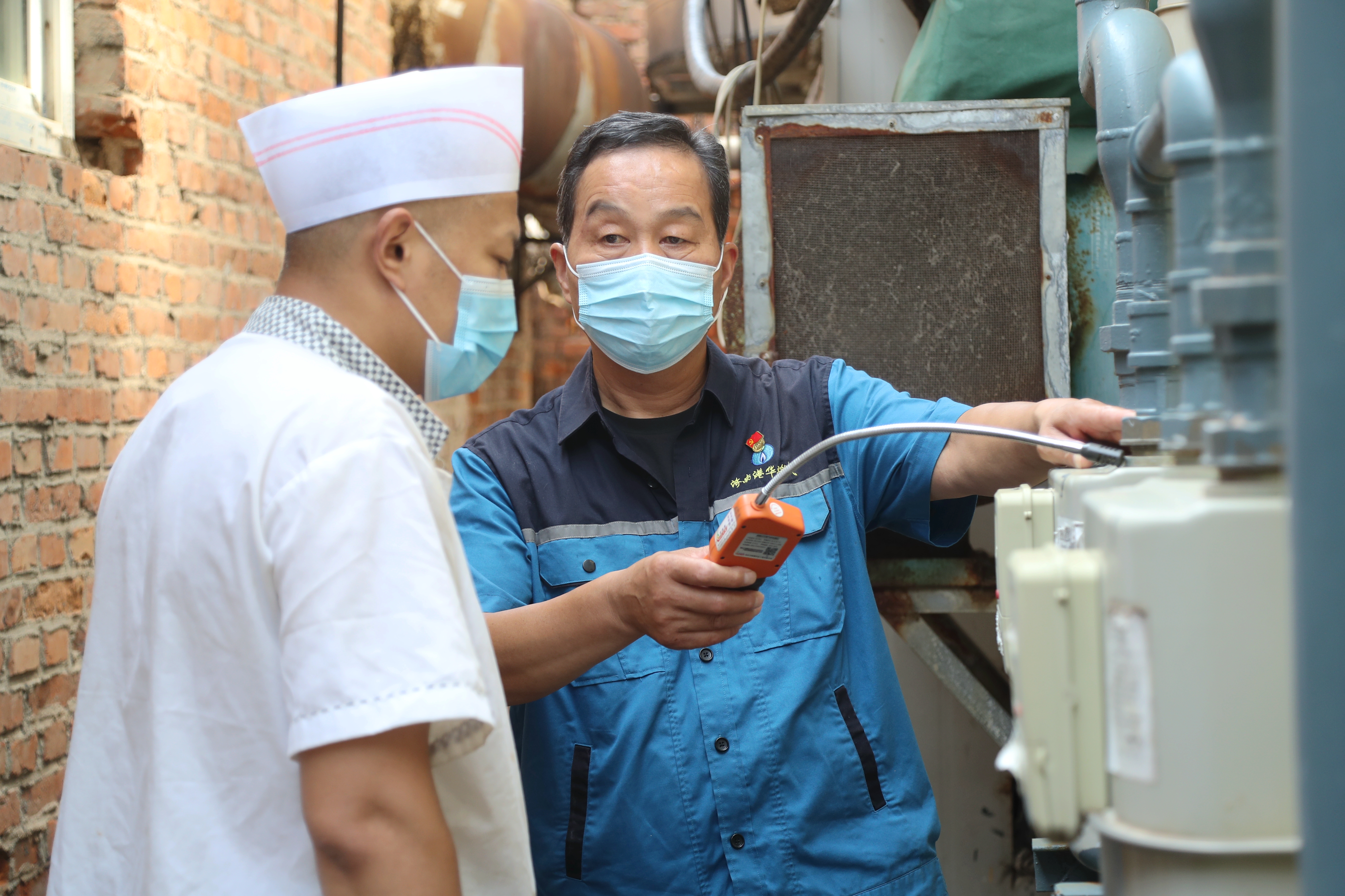 (潘德榮正在對工商餐飲用戶燃?xì)庠罹哌M(jìn)行檢查)