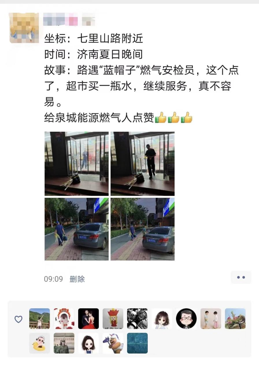 7月29日,濟南能源集團所屬兩家燃氣企業(yè)的同事們刷到了這樣一條朋友圈:“坐標:七里山路附近,時間:濟南夏日晚間,故事:路遇‘藍帽子’燃氣安檢員,這個點了,超市買一瓶水,繼續(xù)服務,真不容易。給泉城能源燃氣人點贊!”簡潔明了的一串字,配上4張“藍帽子”夜間辛勞的身影——手提滿滿一袋子沒拆封的燃氣不銹鋼軟管,在超市匆匆買了一瓶水,又急忙奔赴向下一位用戶家中,令人感嘆不已。