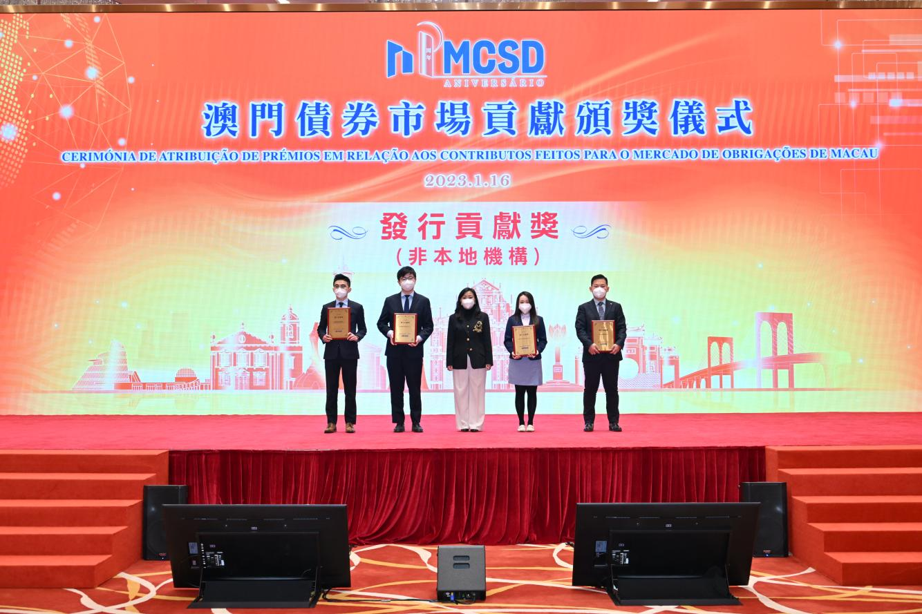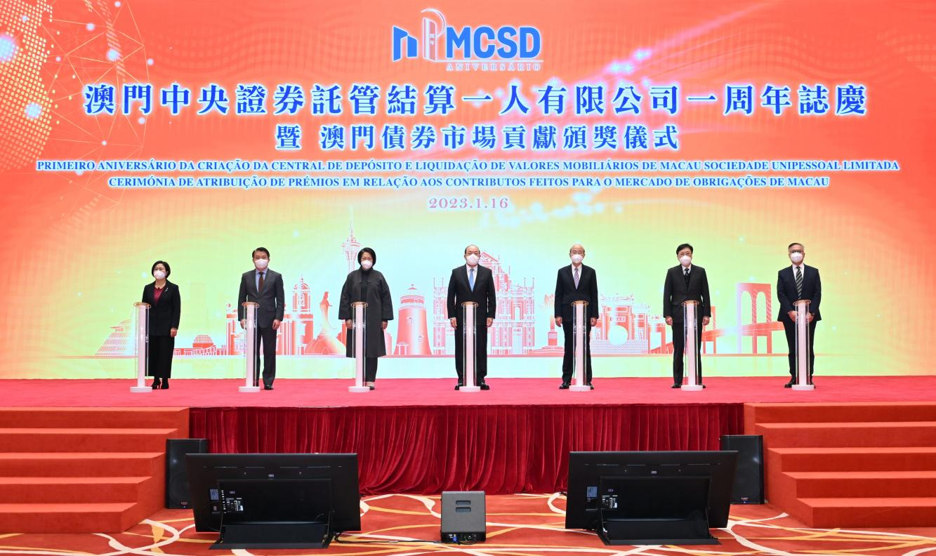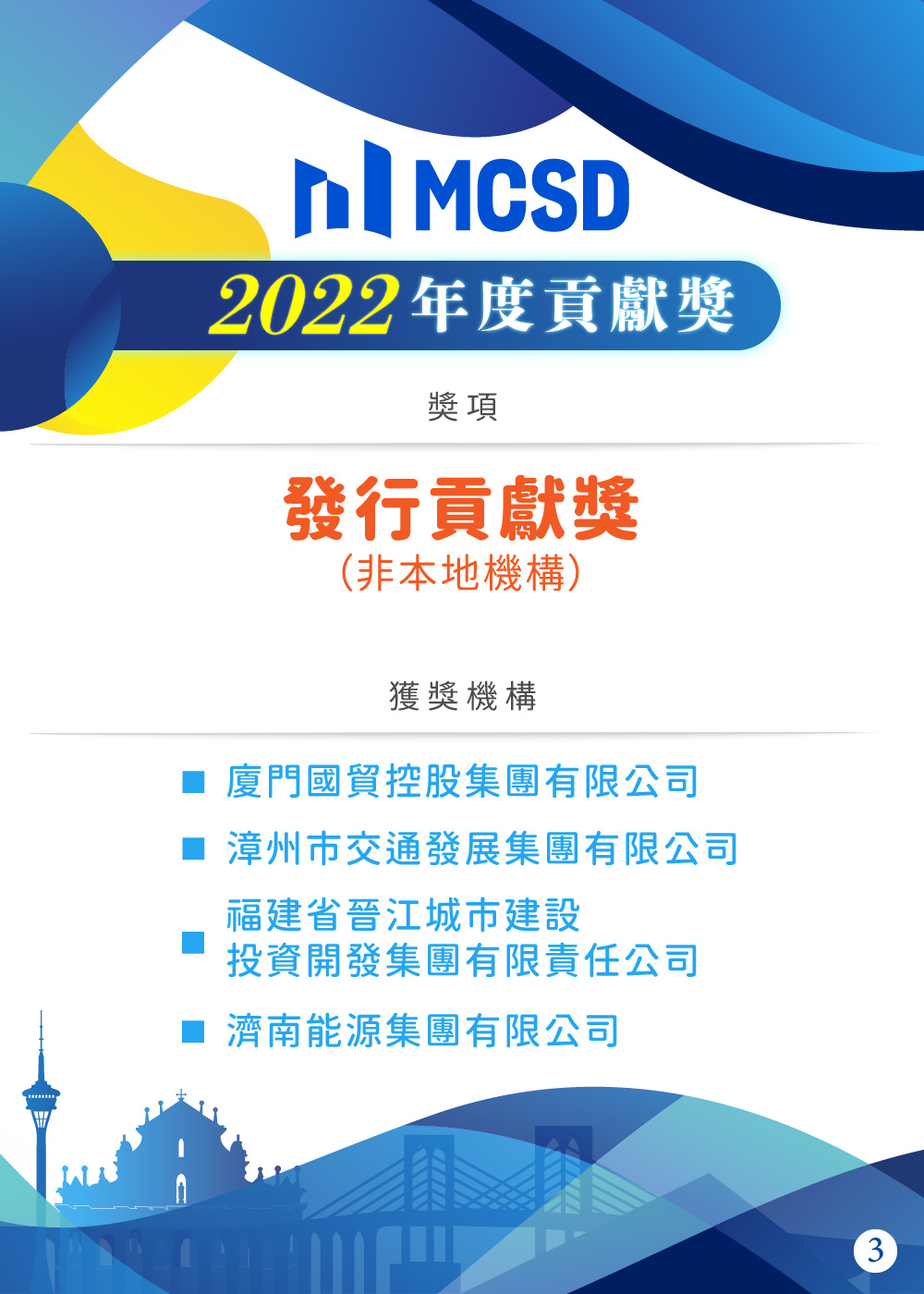 1月16日,澳門金融管理局與澳門中央證券托管結(jié)算一人有限公司(MCSD)合辦活動(dòng)慶祝MCSD成立一周年,行政長(zhǎng)官賀一誠(chéng)等嘉賓主禮?;顒?dòng)中為2022年度在澳門債券市場(chǎng)發(fā)展中作出貢獻(xiàn)的25家機(jī)構(gòu)頒獎(jiǎng),濟(jì)南能源集團(tuán)榮獲發(fā)行貢獻(xiàn)獎(jiǎng)。
