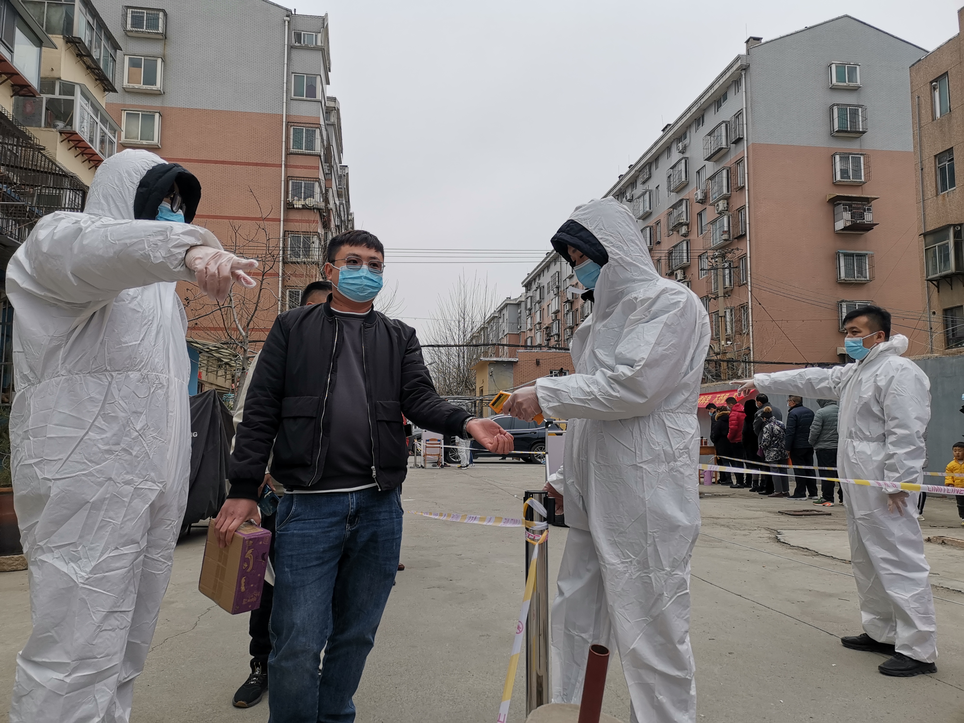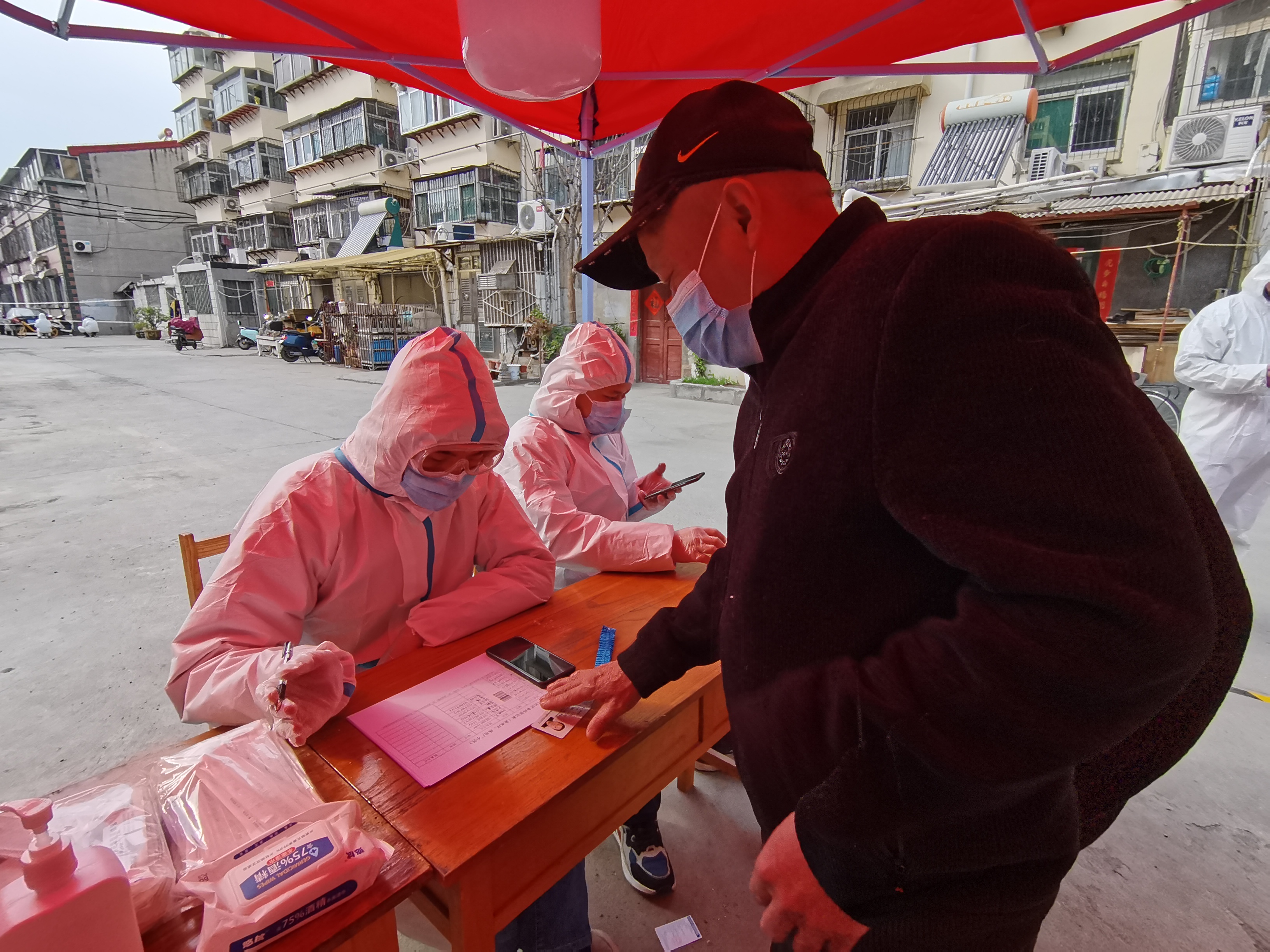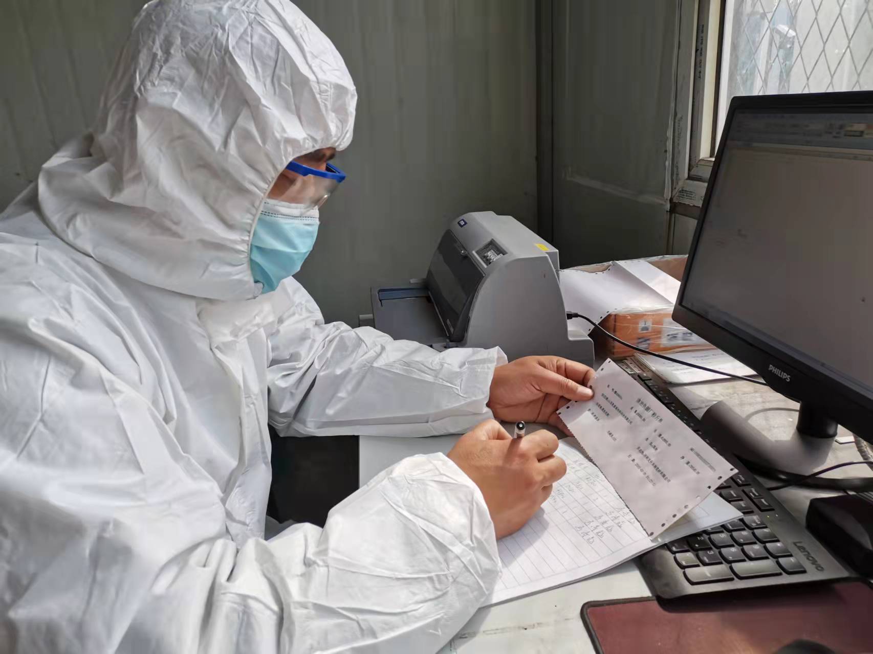 早上7點40分,劉夫龍準(zhǔn)時出現(xiàn)在自己的崗位上,換上一套防護服略作休整,便準(zhǔn)備開始一上午緊張的工作。今天劉夫龍的職責(zé)是協(xié)助醫(yī)務(wù)工作人員做核酸檢測,他們的志愿服務(wù)隊和醫(yī)務(wù)人員一共被分成了四組,平均每組有三個人,其中醫(yī)務(wù)人員負(fù)責(zé)核酸檢測,另外兩名志愿者一個負(fù)責(zé)為居民掃碼檢查相關(guān)信息,而劉夫龍則是負(fù)責(zé)紙質(zhì)登記居民的詳細信息。“除記錄居民的身份信息外,還要仔細確認(rèn)居民的條形碼與核酸檢測杯的條形碼是否對應(yīng)正確。”劉夫龍稱,這是個細活,萬不可馬虎大意。