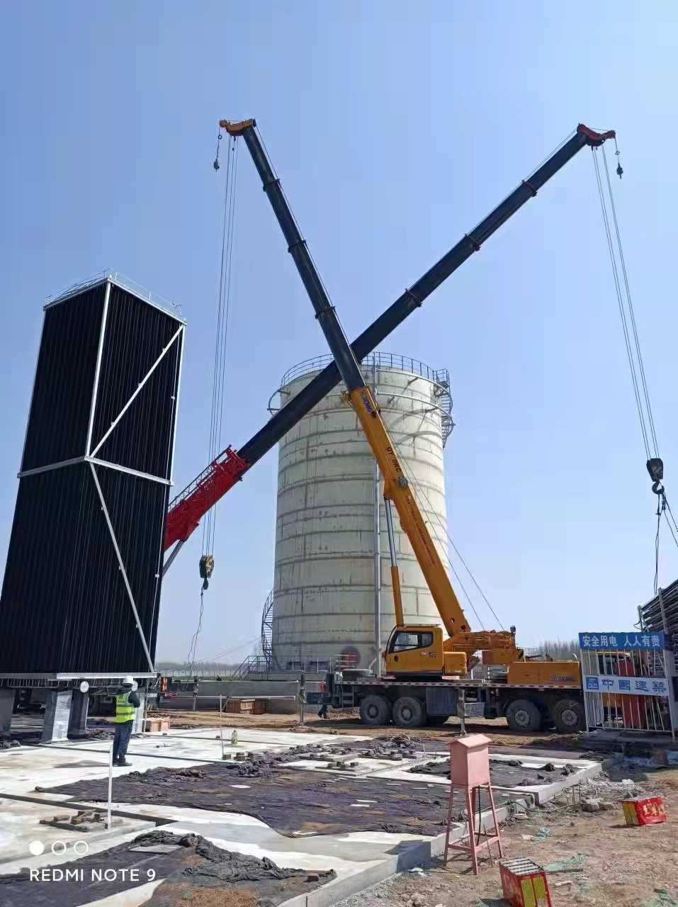 凌晨3點鐘,汽化器運輸車隊的車輛依次進場,車輛運輸?shù)恼墙箯RLNG項目所急需的高壓系統(tǒng)汽化設(shè)備。穿著防護服,閻亮帶領(lǐng)防疫小組開始對車輛進行第一次消殺。噴灑的消毒液落在大型設(shè)備上,車輛的邊邊角角也成為了重點消殺的細節(jié)。上午8點半,起重車輛入場完成支設(shè),第一臺運輸車輛完成第二次消殺后進場。9時整,第一臺汽化器吊裝到位。下午4點,第二批次7臺高壓空時式汽化器、4臺空溫式復(fù)熱汽化器及高壓水浴復(fù)熱器吊裝全部完成。