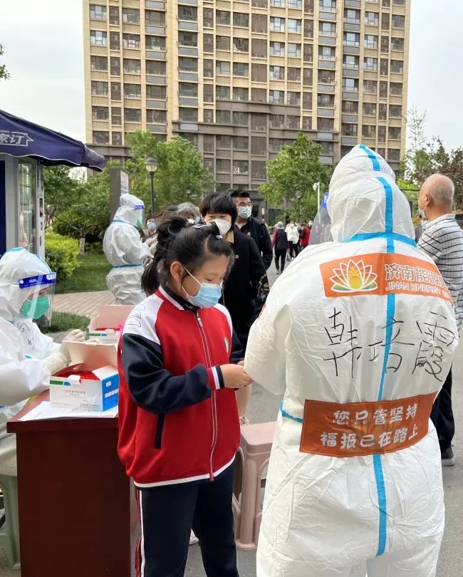 第五批下沉隊(duì)伍組隊(duì)時(shí),韓培霞終于心愿達(dá)成。6日的午后,持續(xù)高溫的濟(jì)南忽然刮起大風(fēng),氣溫驟降,傍晚核酸檢測(cè)時(shí),社區(qū)居民都穿上了厚厚的外套。只穿了一件短袖的韓培霞,被冷風(fēng)吹的不停揉搓胳膊取暖。她身旁的社區(qū)工作人員見狀,急忙回去拿了一件外套讓他穿上,“疫情嚴(yán)峻,可千萬別感冒了呀。”她心中涌上濃濃的暖意,一時(shí)竟感動(dòng)地說不出話來。