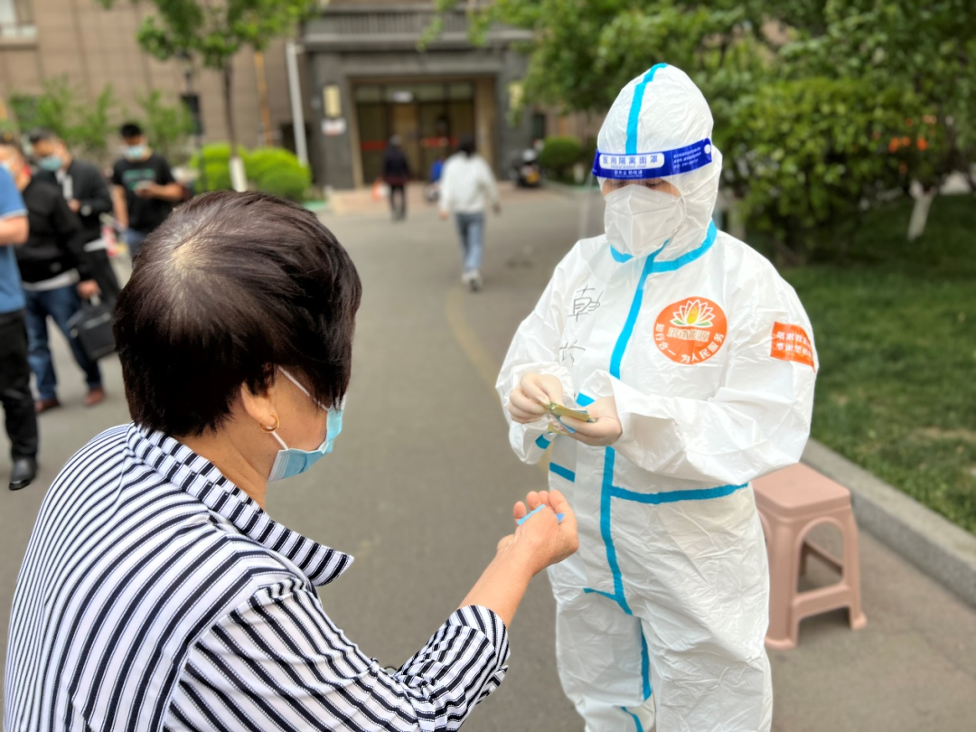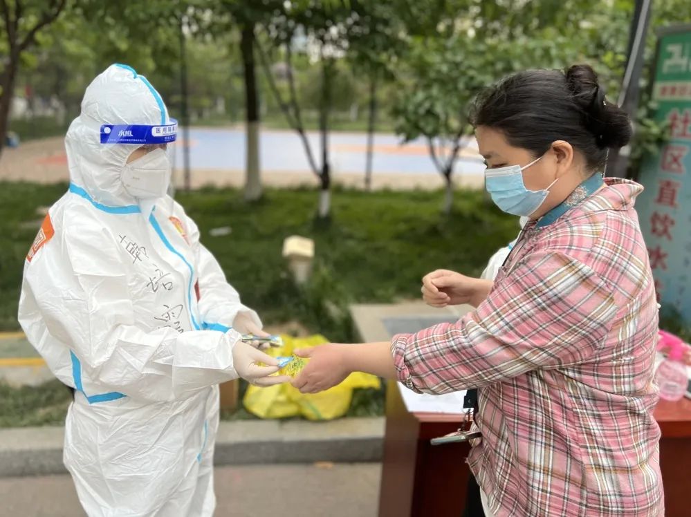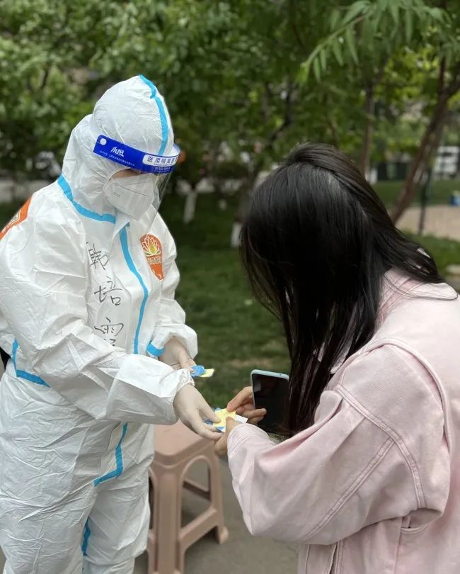 5月6日晚10點(diǎn)左右,剛剛結(jié)束社區(qū)工作,接到了兒子打來的電話。為了方便換下防護(hù)服,她將手機(jī)調(diào)成了免提模式,沒想到,剛一調(diào)好,社區(qū)工作人員跑過來著急地問道:“咱今天的核酸粘貼發(fā)了多少???”一陣慌張的韓培霞立刻將手機(jī)拿起捂住話筒,小聲地對(duì)工作人員說:“1990個(gè),明天上午還要檢測(cè)200個(gè)左右。”