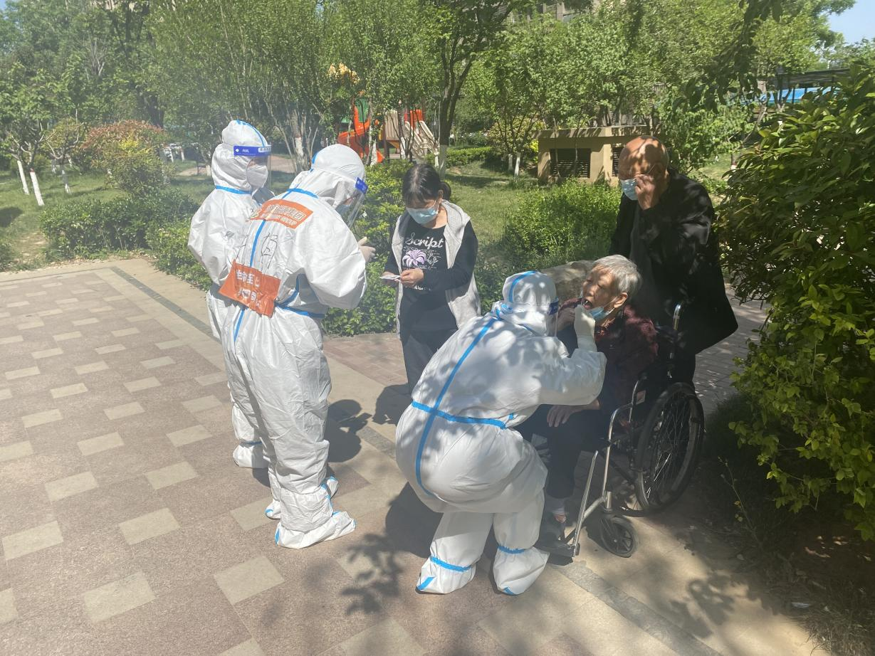 在解釋了目前兩位老人的情況后,老人的女兒表示馬上拿著身份證過來。當(dāng)時,外面是近30℃的高溫,等待期間,范炳麗將老人的輪椅推到樹蔭下,并安撫兩位老人不要著急。等待身份證送來后,為了方便老人,范炳麗配合醫(yī)護(hù)人員在原地為兩位老人進(jìn)行了核酸采樣。“謝謝你們這么細(xì)心,太感謝了!”老人的女兒不停地表示著感謝,兩位老人也不斷地向他們點頭,并雙手合十表達(dá)著謝意。“不用客氣,這是我們應(yīng)該做的。老人不方便出來的話,我們可以上門檢測!”他們向老人擺手,并囑咐著路上小心。