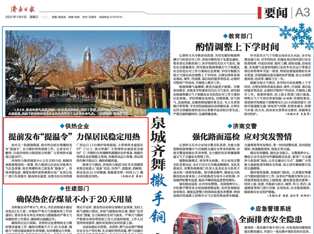 【濟(jì)南日?qǐng)?bào)A3】提前發(fā)布“提溫令” 力保居民穩(wěn)定用熱